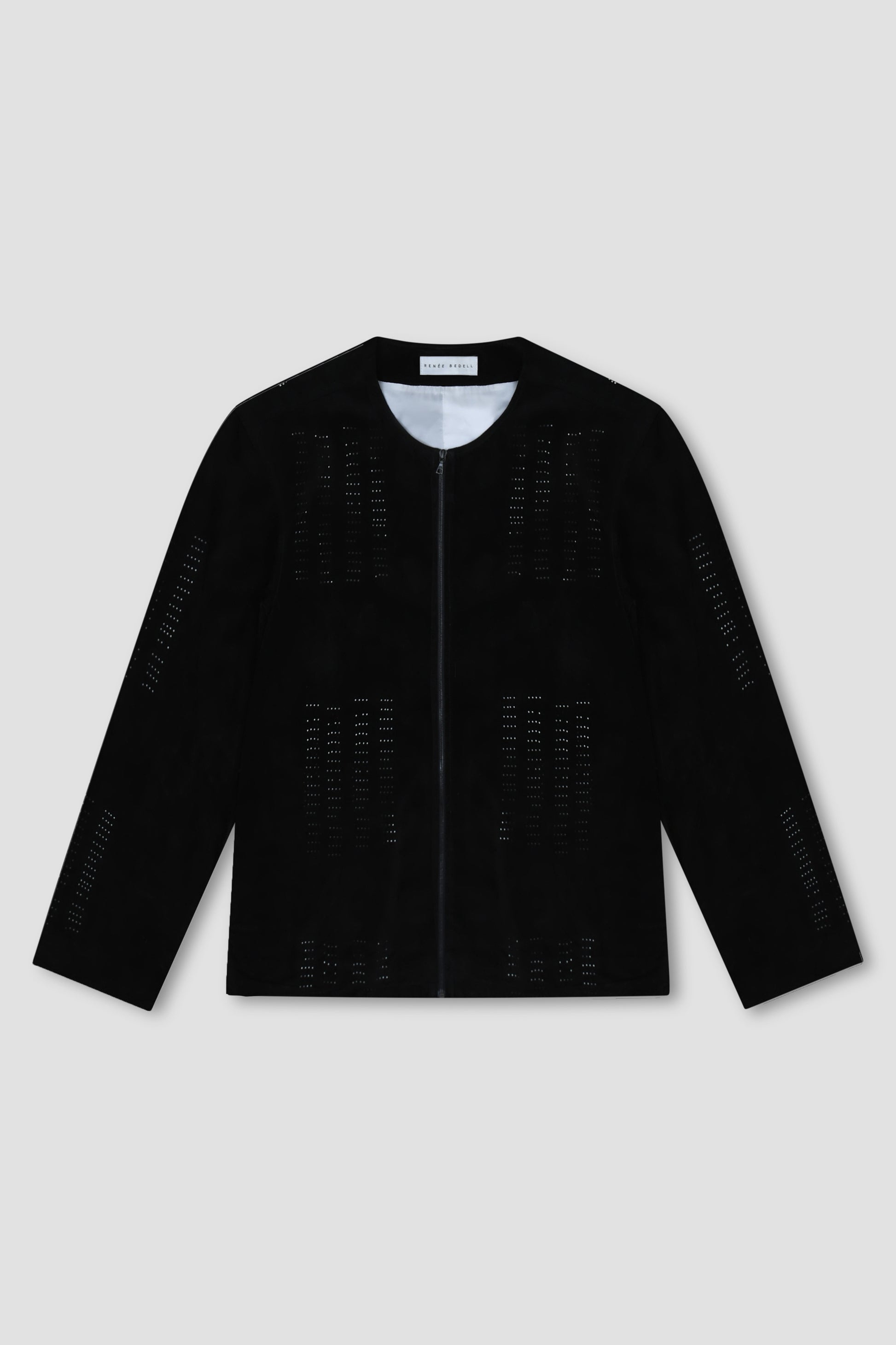 Black suede laser cut top with contrast white lining. Featuring full front zip closure and two side pockets