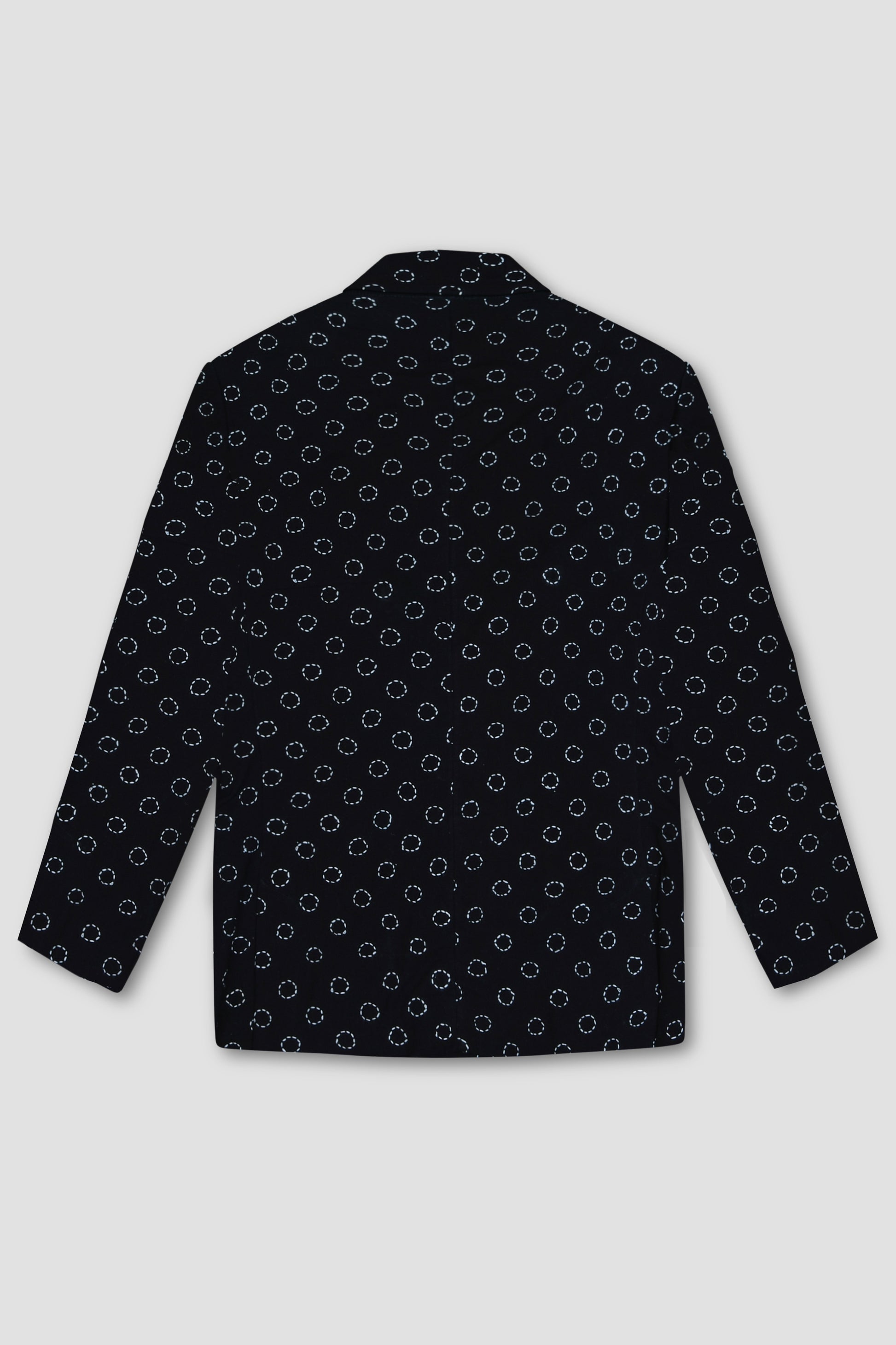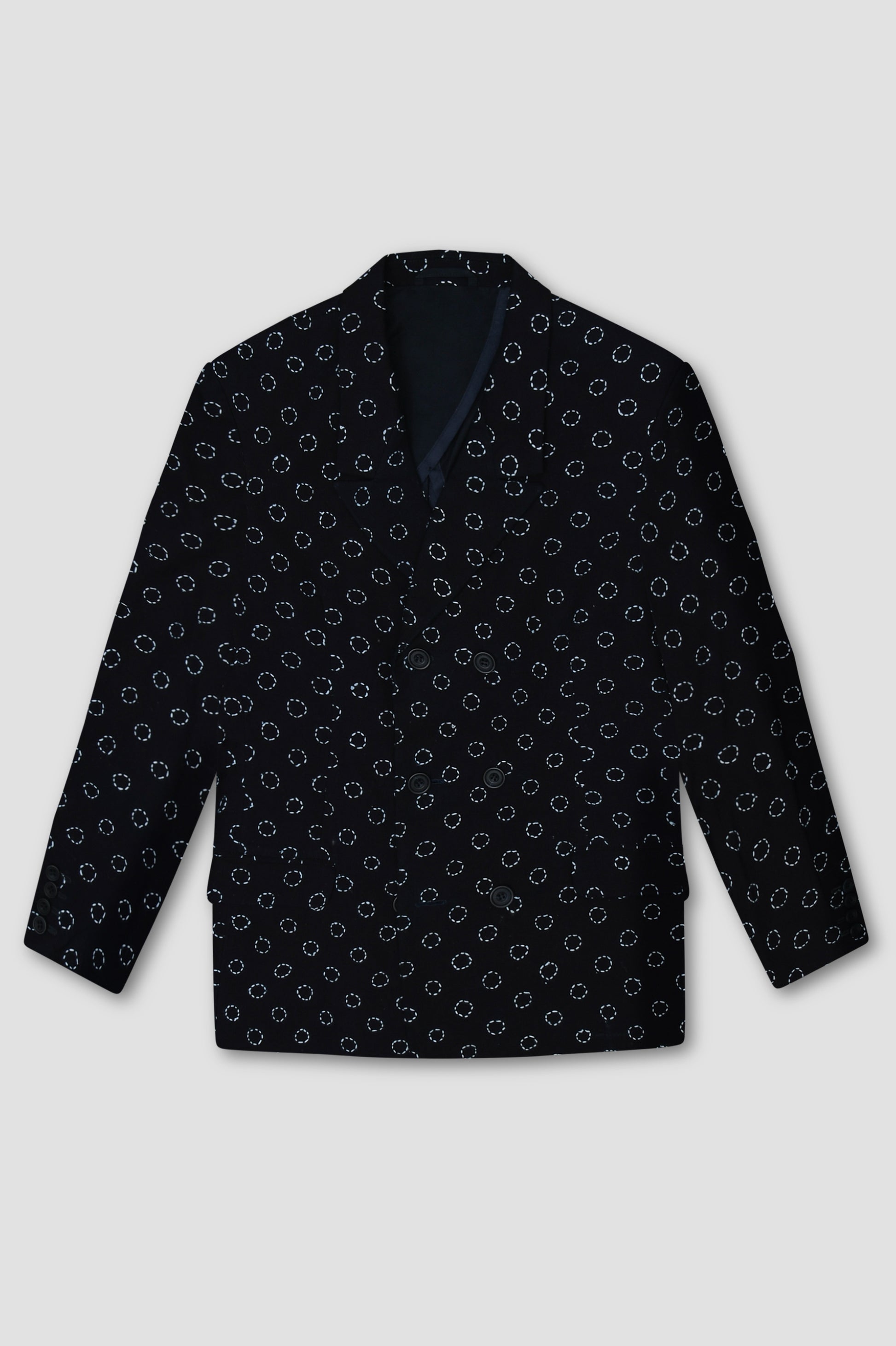 Double breasted Indigo Dyed Cotton Tailored Jacket with half lining. Vintage indigo cloth from Japan with hand stitched circles. 6 buttons on the front and 4 on each cuff. Front pockets. Wool melton undercollar. Binding on all interior seams for a clean finished look.