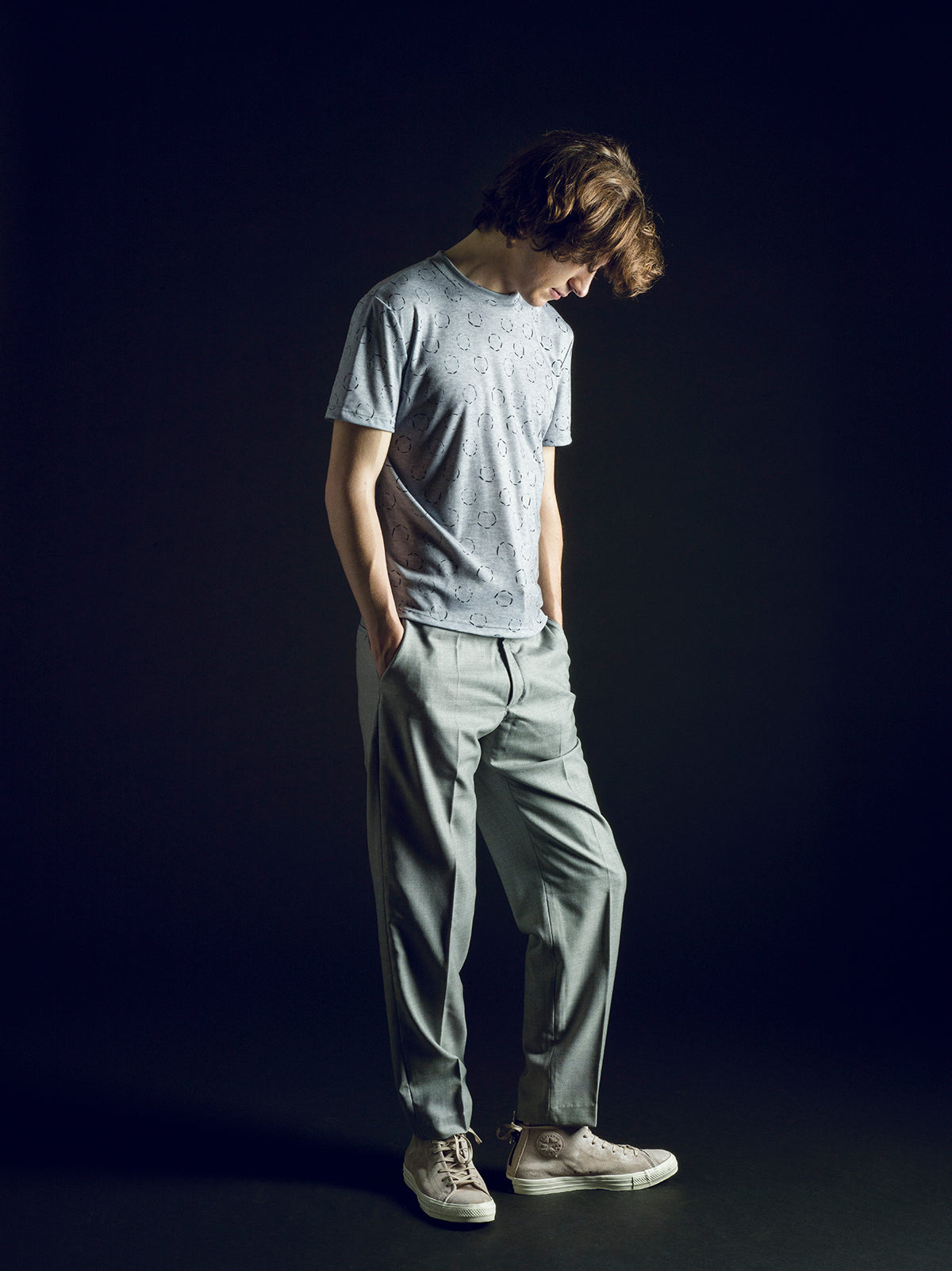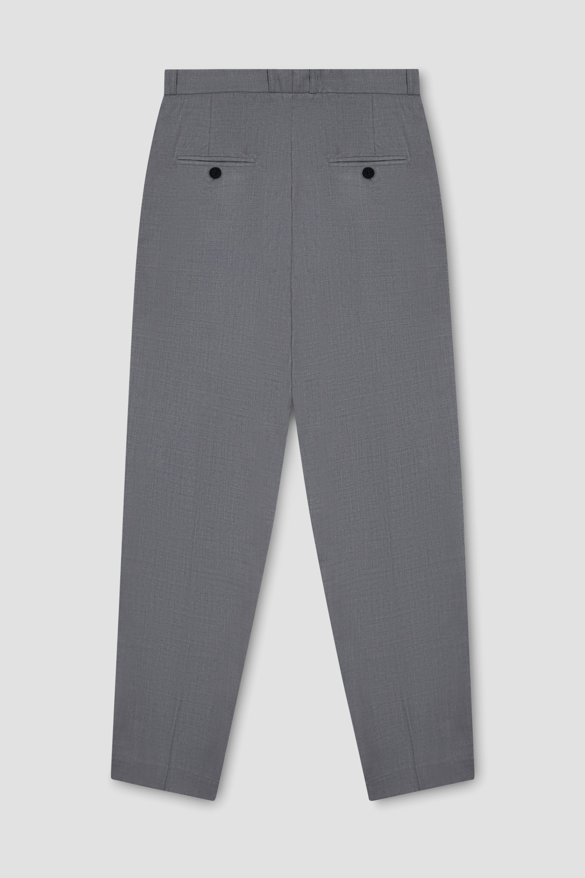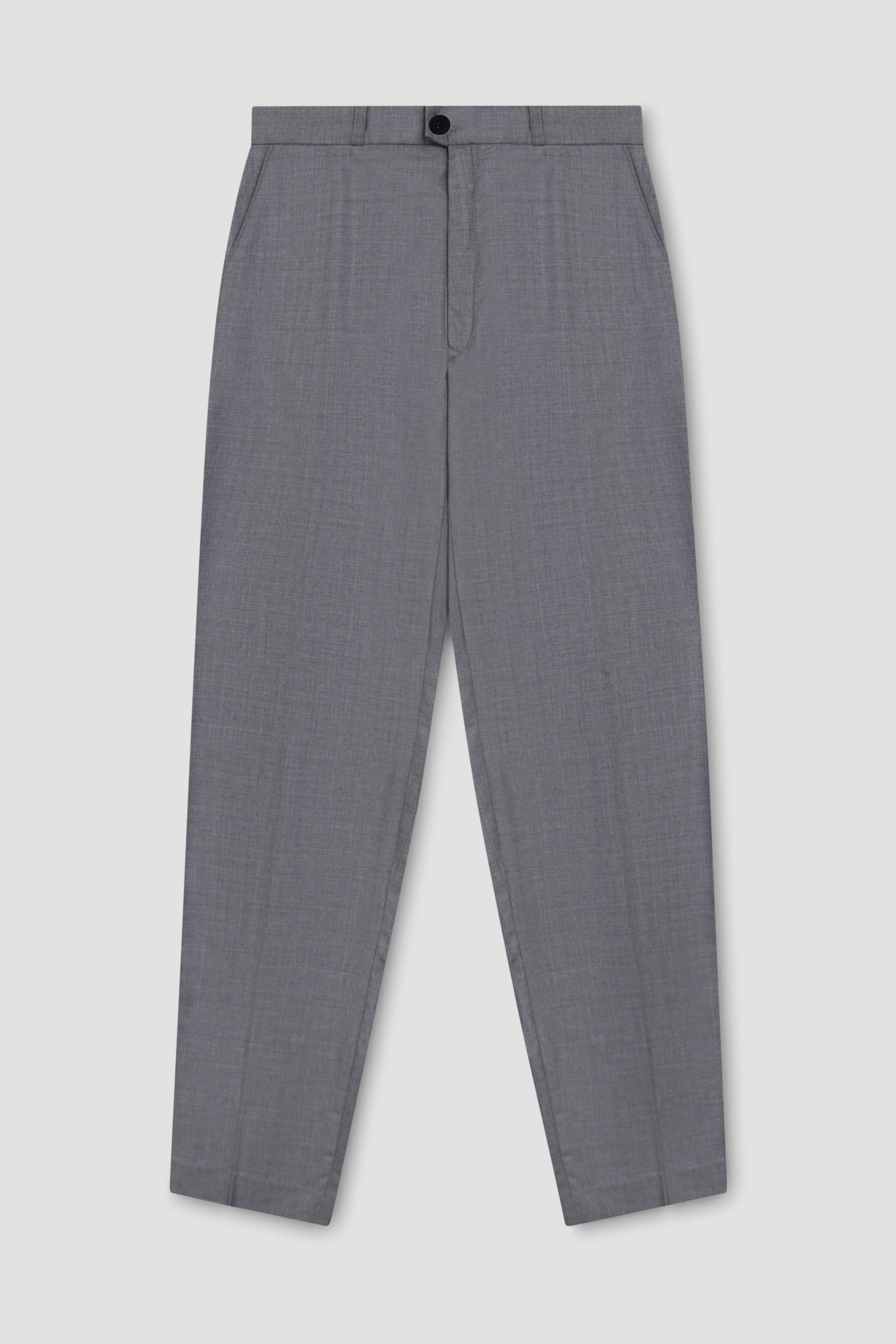 Grey tailored trouser with beltloops, two front pockets and two back jet pockets. Half-lined at the front.