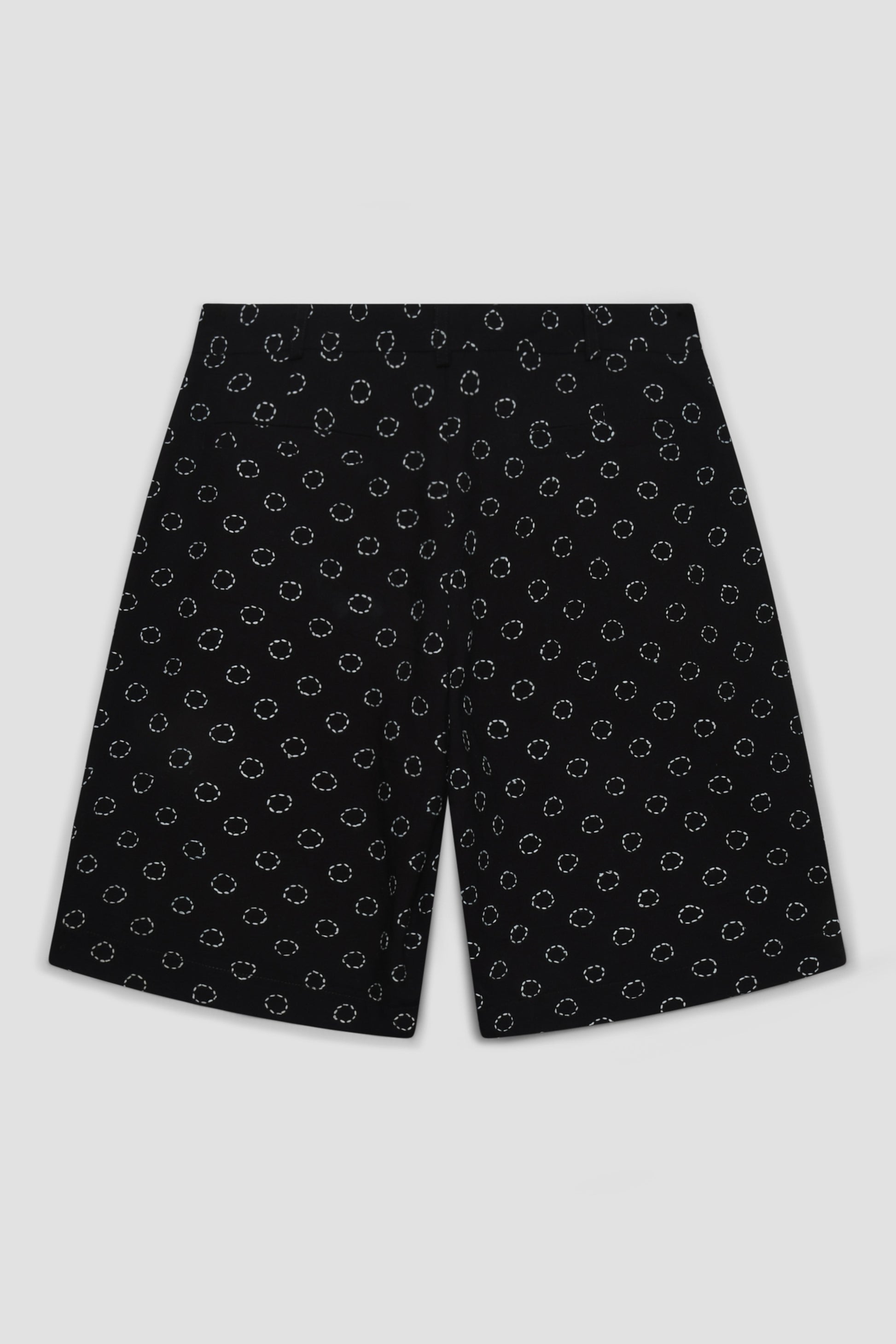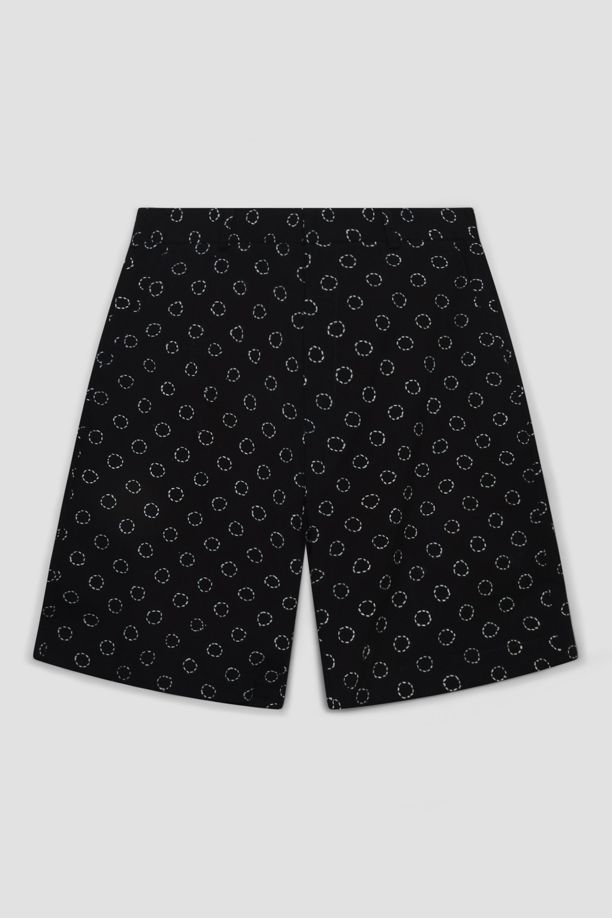 Indigo-dyed embroidered tailored shorts. Vintage indigo cloth from Japan with hand stitched circles. Features two front pockets, two back jet pockets and belt loops. Hook and eye fastening at the waist with metal Riri zip fly.