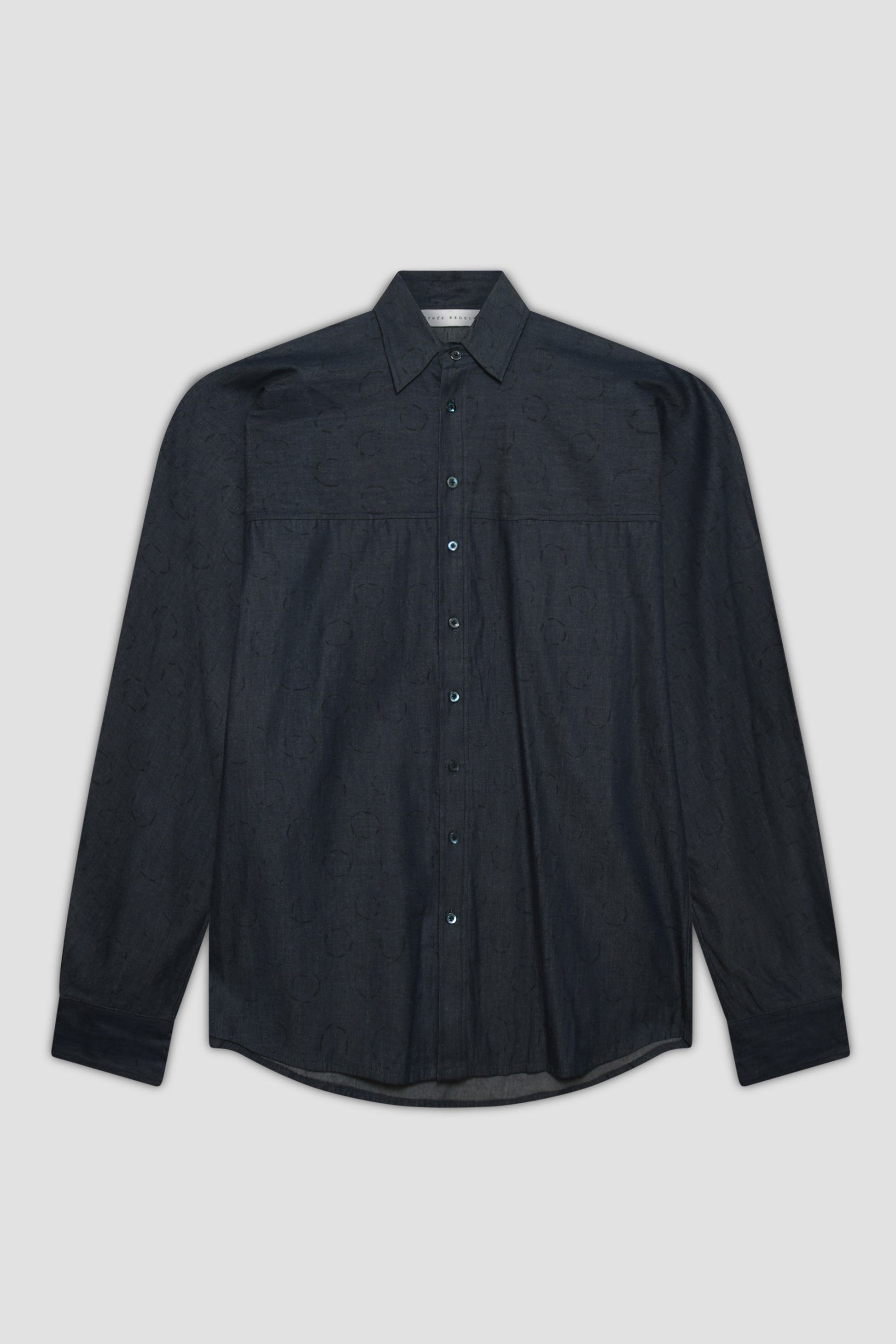 Printed denim button down shirt featuring our unique raglan-style sleeve cut-in-one piece for a relaxed fit.