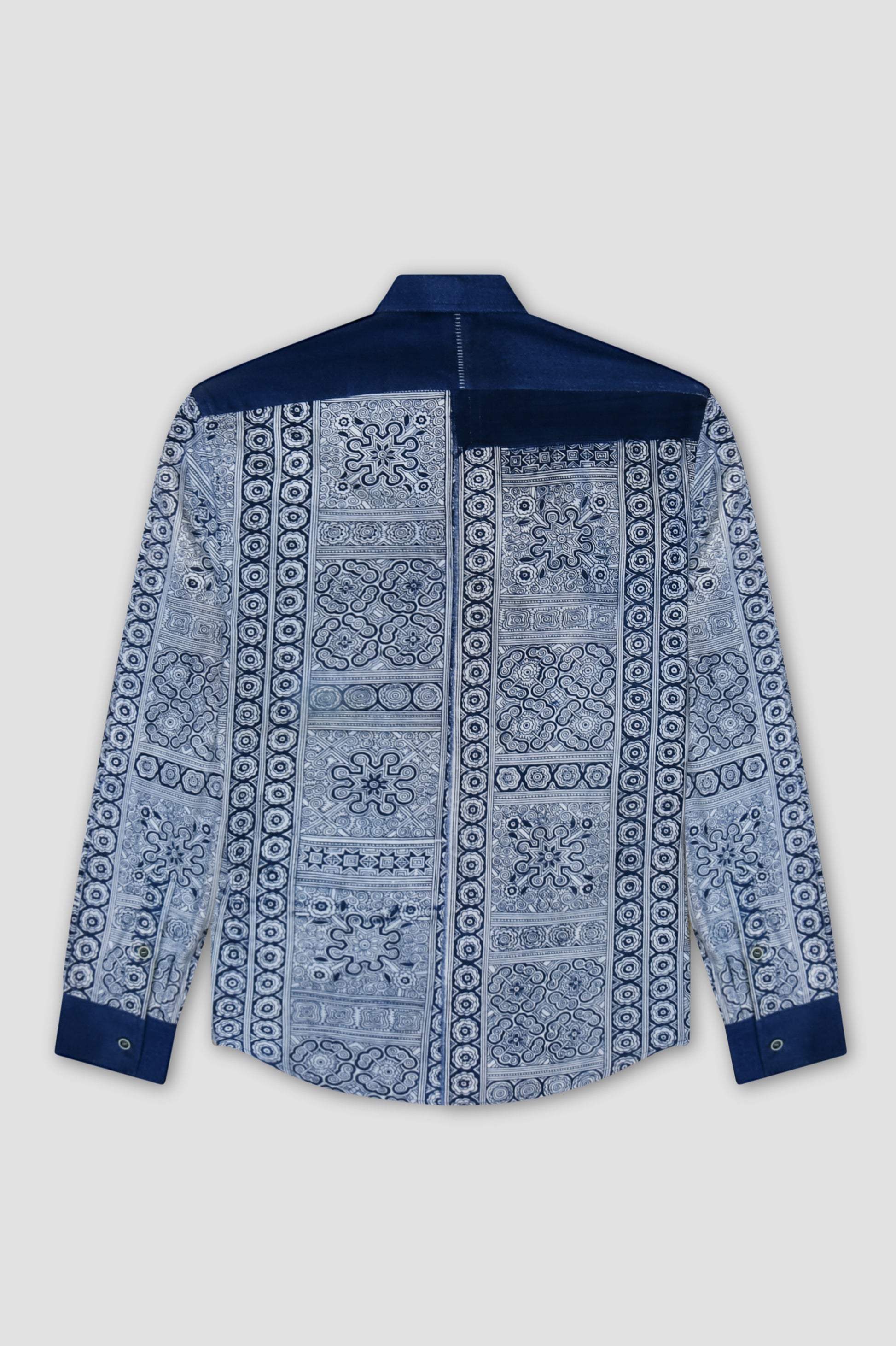 Regular fit button down shirt made with vintage Chinese tribal printed textile and dyed with real indigo. Features original handstitching details on back yoke and cuff.