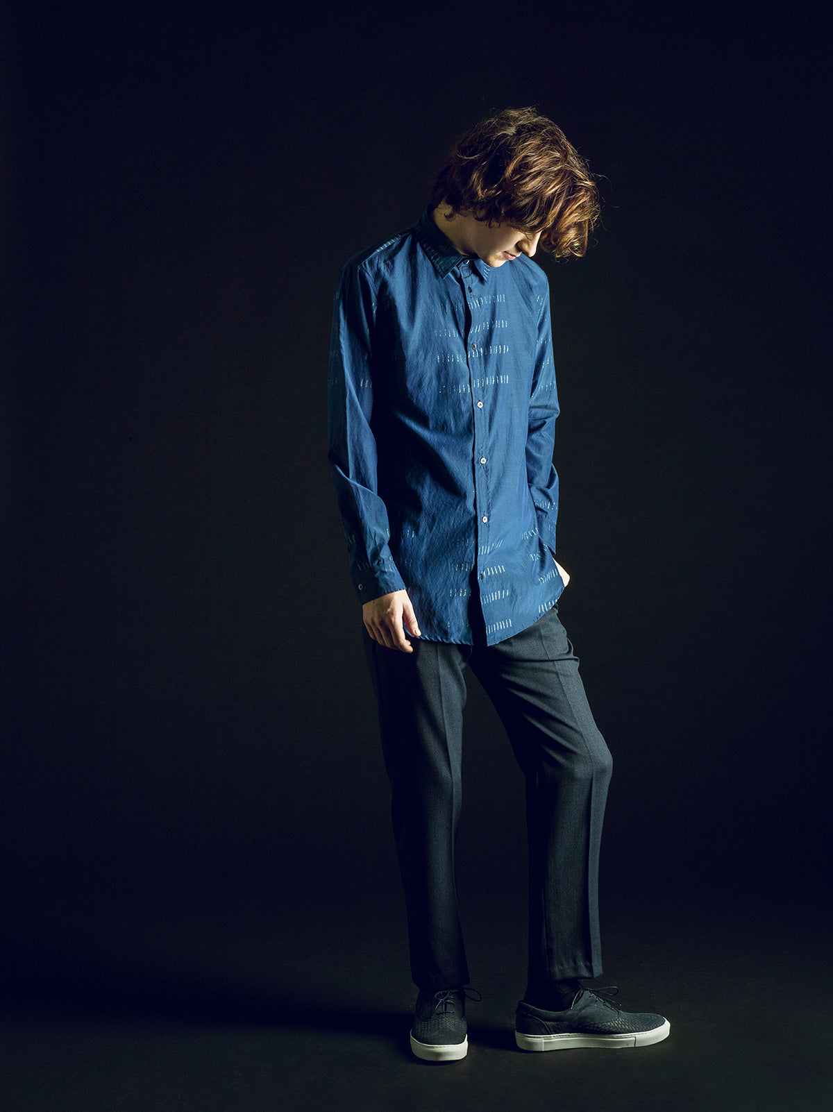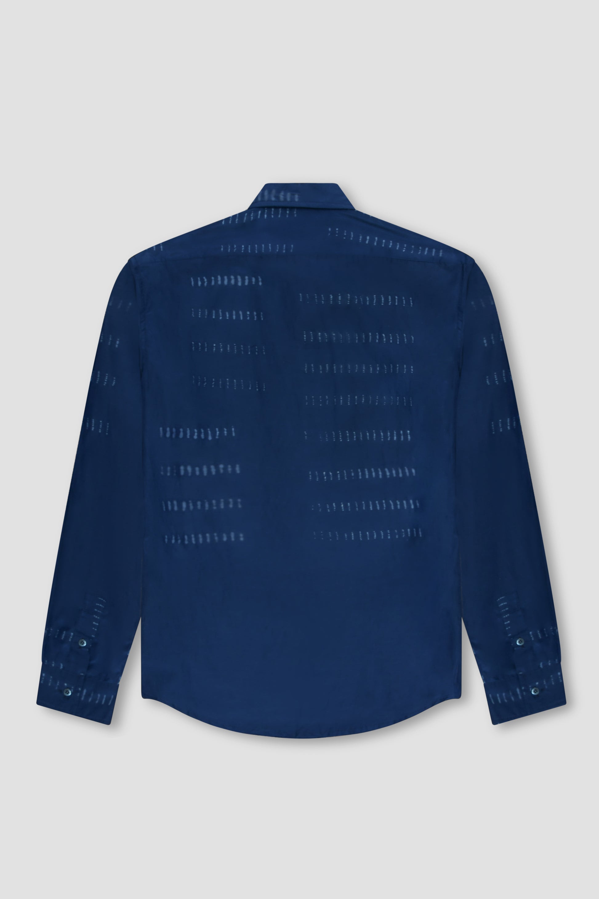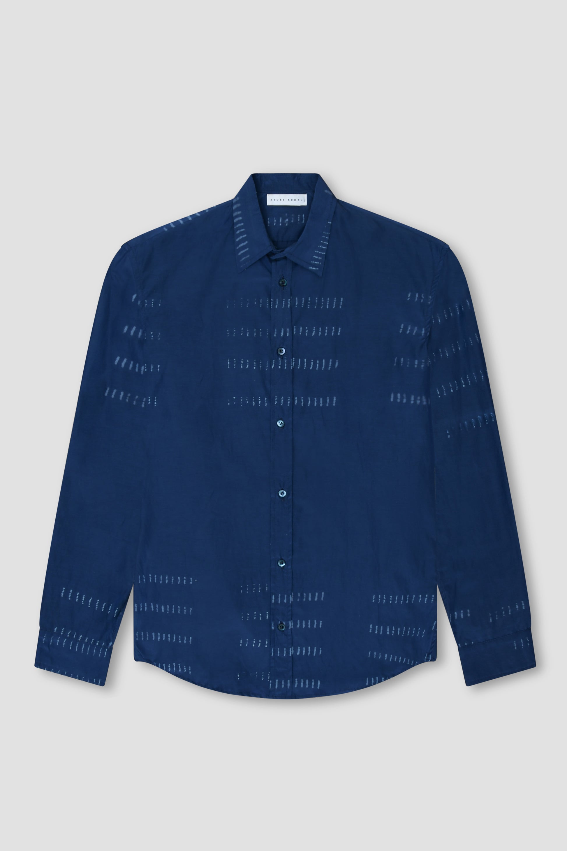 Regular fit button down long sleeve shirt made in a silk cotton blend. Hand-dyed and screen printed in London.